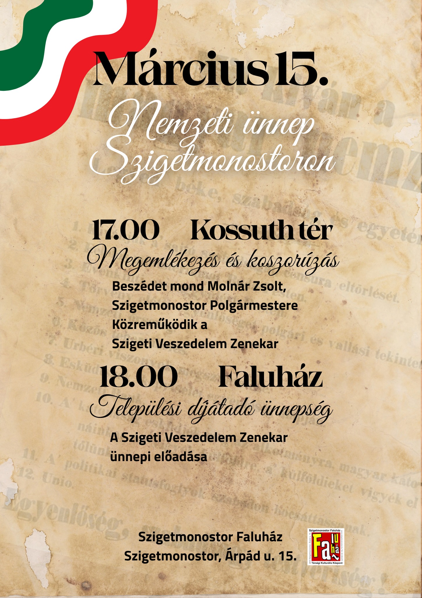 Nemzeti ünnep Szigetmonostoron Dátum 2026.03.15. Időpont 17:00 Kossuth tér 2015 Szigetmonostor, Kossuth tér
