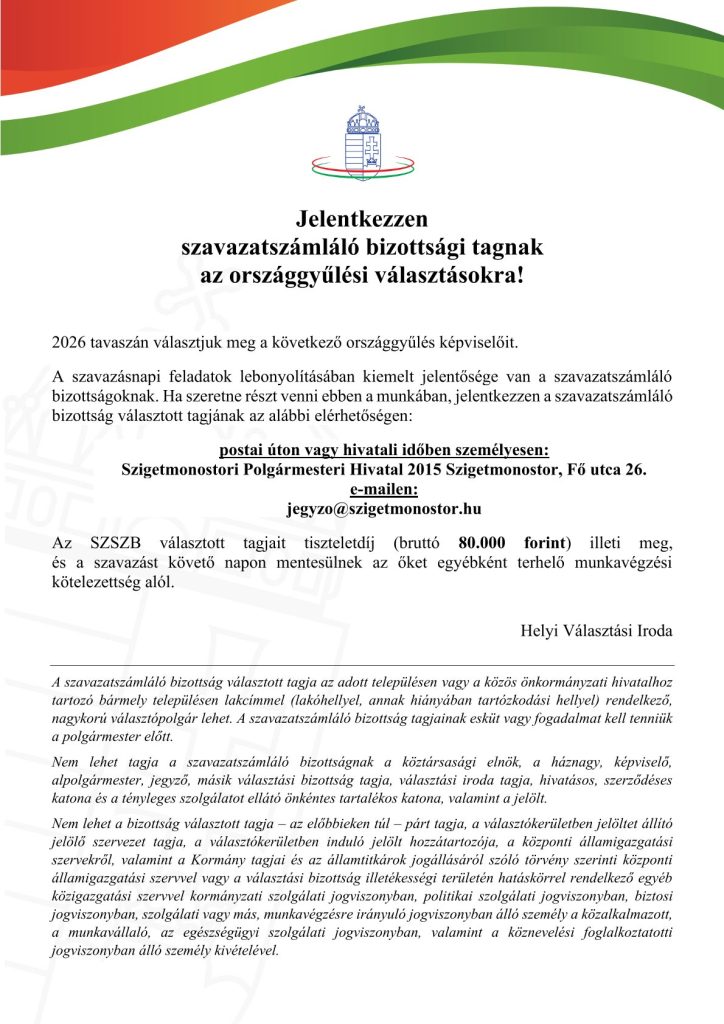 Szigetmonostor Község Helyi Választási Irodája szavazatszámláló bizottsági feladatokat vállaló, szigetmonostori lakóhelyű választópolgárok jelentkezését várja választott tagként a község területén működő szavazatszámláló bizottságokba.