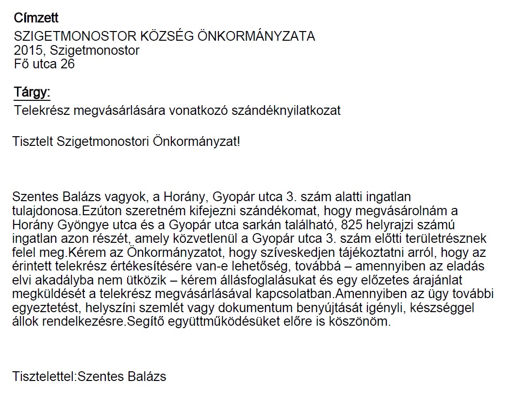 15.Tulajdoni ügyek 825 helyrajzi számú ingatlan adásvételi ügye